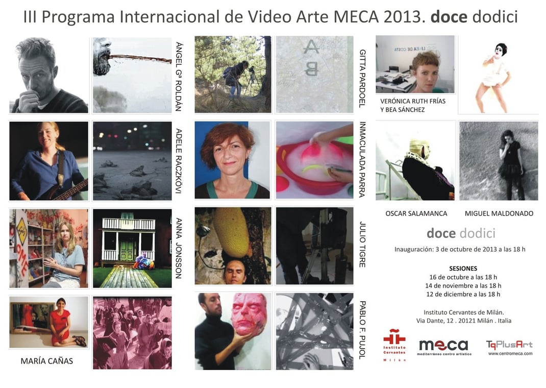 El número Doce ha sido a lo largo de la historia de la humanidad el más representativo y enigmático. En sus orígenes mitológicos, filosóficos, religiosos o científicos el sentido del doce ha devenido en aspectos positivos y de perfección. El doce también ha simbolizado la prudencia y el equilibrio. En este sentido MECA Mediterráneo Centro Artístico ha organizado el Programa Doce. Dodici. Arte Contemporáneo que se celebrará en el Instituto Cervantes de Milán desde el 3 de octubre de 2013 al 9 de enero de 2014.