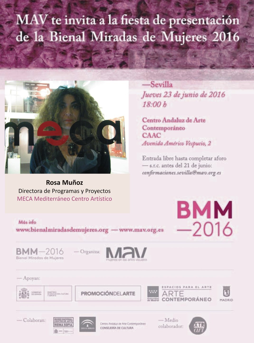 El pasado jueves 23 de Junio, Rosa Muñoz directora de programas y proyectos de MECA, presentó en el CAAC (Centro Andaluz de Arte Contemporáneo) de Sevilla, los proyectos Ars Visibilis que ha organizado en 2013,2014 y 2016 dentro del programa BienalMAV, Mujeres Artistas Visuales
