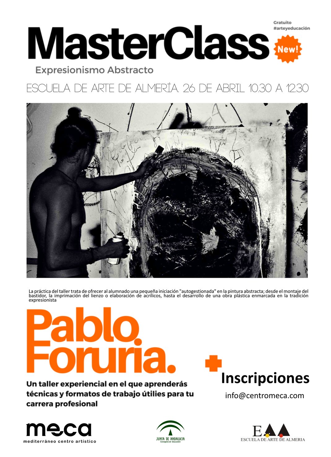MECA Mediterráneo Centro Artístico ha organizado en la Escuela de Arte de Almería, el Taller Práctico de Pintura Contemporánea. La práctica del Expresionismo Abstracto, que será impartido por el artista afincado en Almería, Pablo Foruria el próximo 26 de abril, de 10.30 a 12.30 h.