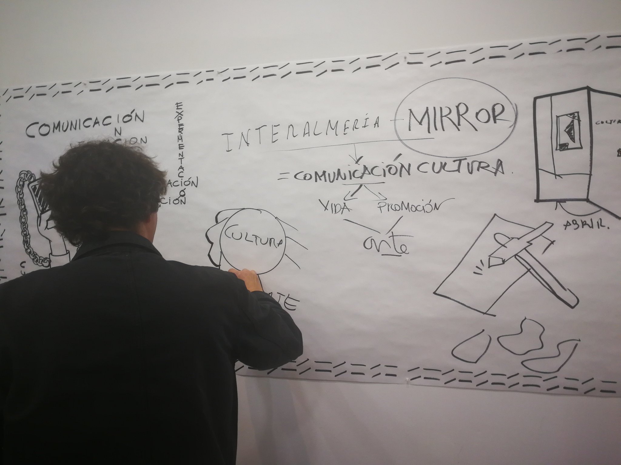 El proyecto MIRROR. ENCUENTRO DE ARTES Y CULTURA tiene dos objetivos principales: por un lado visibilizar el ciclo de relaciones fluidas entre los diferentes agentes que componen el panorama artístico y cultural de diferentes entornos y territorios y cómo influyen en el desarrollo de procesos de transformación social, y por otro, desarrollar procesos conjuntos, visuales e intelectuales entre los diferentes participantes, entendiéndose lo visual como la acción de relatar los contenidos expuestos a través del diseño de historias dibujadas por los artistas invitados. Se ofrece al espectador y a los participantes como un taller abierto y experiencial.