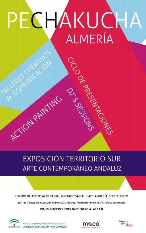 Dispondremos de varias secuencias de presentaciones PechaKucha Almería a lo largo de una jornada en forma de escenario informal e inusual en el que la escenografía basada en expresiones creativas sea la base de presentación de propuestas de siendo la participación de una treintena de empresas. La clave estará en establecer una sorprendente emoción a cada participante ( el que expone y el que escucha) para potenciar su participación y así conseguir su implicación real en los siguientes eventos.