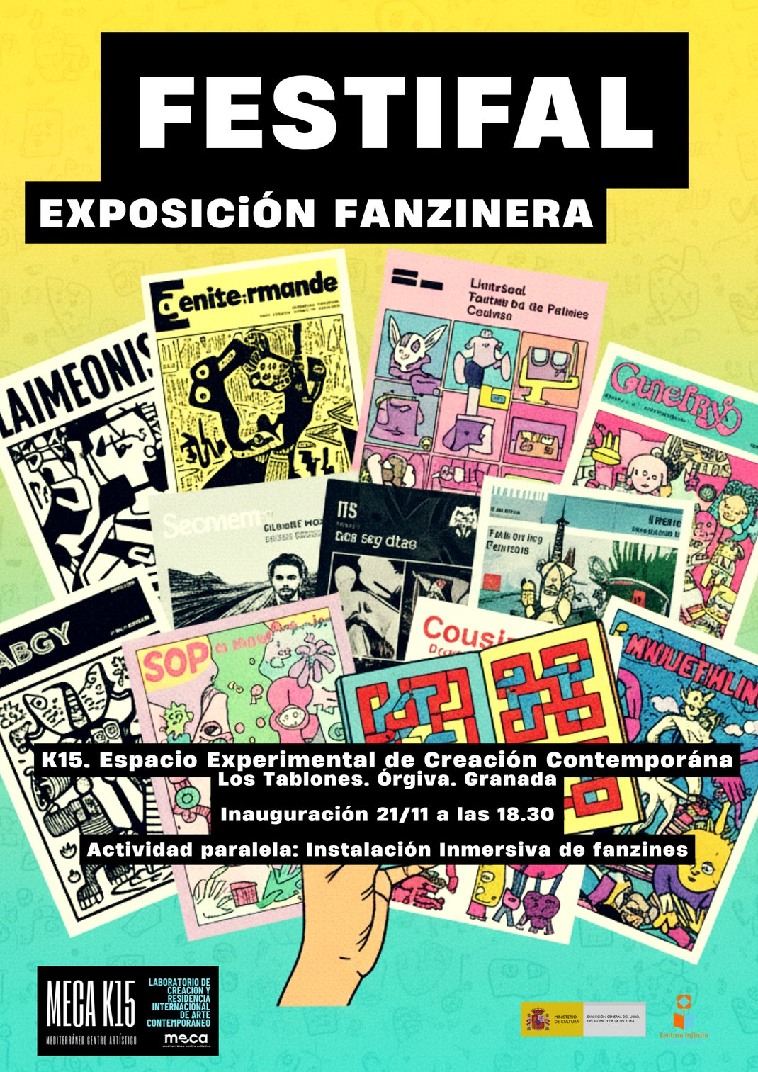 Tras el éxito del I Festival de Fanzines Literarios FESTIFAL celebrado en octubre en Almería, seguimos su camino hacia la Alpujarra granadina. Presentamos la segunda exposición de fanzines en MECA K15, Espacio Experimental de Creación Contemporánea en Los Tablones, Órgiva, considerándose como una exposición única en toda la comarca ya que se dedica exclusivamente al universo del fanzine como territorio creativo, político y emocional.