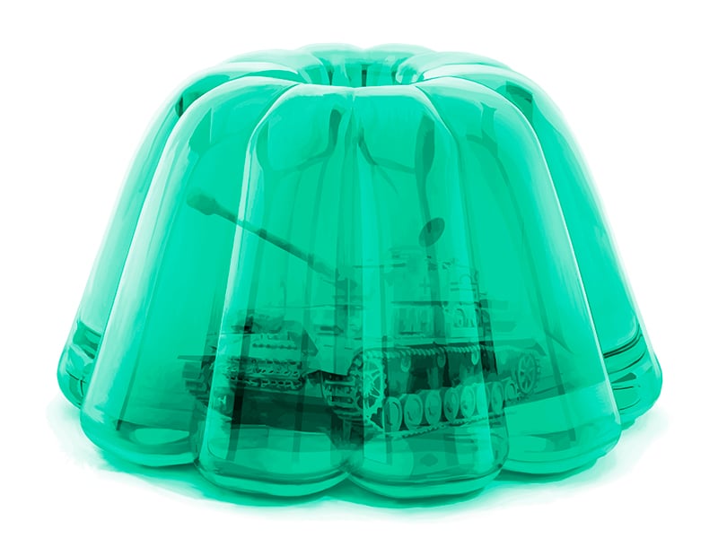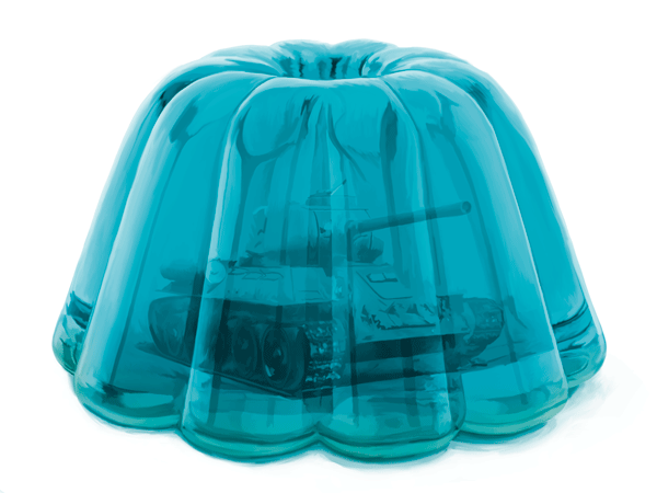 En el núcleo de esta serie late una paradoja visual y semántica de gran precisión: tanques encapsulados en cuerpos blandos y translúcidos de gelatina, cada uno vinculado a un color hexadecimal derivado de un mineral. Este lenguaje formal, aparentemente simple, opera como una estructura simbólica densa. La dureza de la máquina bélica, concebida históricamente como emblema de poder, control y agresión, se ve suspendida y contenida dentro de una materia blanda y luminosa, asociada culturalmente a lo doméstico, lo lúdico y lo infantil. De esa fricción emerge un territorio inquietante, en el que la violencia no desaparece, sino que queda latente, sublimada bajo la apariencia seductora de una forma casi inocente.