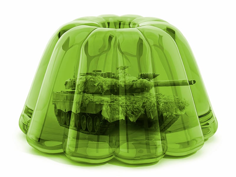 Esta operación visual y conceptual es, en esencia, una reflexión sobre el modo en que la violencia se representa y se consume en la sociedad contemporánea. En un presente donde la experiencia del conflicto se filtra a través de pantallas y dispositivos tecnológicos, la guerra se convierte en imagen —y la imagen en espectáculo—. Lo bélico, mediado y estetizado, deja de herir directamente para ser digerido, consumido y compartido. Del Valle expone este proceso al desnudo: la gelatina no solo envuelve al tanque, lo traduce; lo vuelve parte de un relato visual que evidencia la distancia crítica entre la realidad de la violencia y su percepción social.